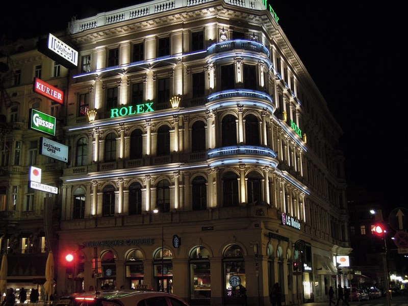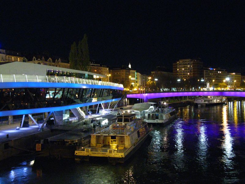 Vienna – I due ponti sul Canale del Danubio illuminano l’acqua con vivacità. Le luci viola e rosse invitano a divertirsi. Una passerella privilegiata di fianco all’acqua è la lucente e moderna sede del ristorante-caffè “Motto am Fluss”. Da qui si gode anche la vista sulle linee dell’albergo Sofitel di là del fiume. Nei primi piani sembra essersi incuneato uno spazio che ne interrompe la linearità e arriva a far credere che ne possa anche mettere in pericolo la statica, visto che i piani alti sembrano sostenuti solo da due pilastri che vanno a conficcarsi in un soffitto illuminato da vetrate colorate. Nello stesso edificio si trova un grande magazzino di design, lo “Stilwerk”. Le scale mobili si muovono come nastri luminosi, dal soffitto pendono lunghi arazzi con motivi geometrici.