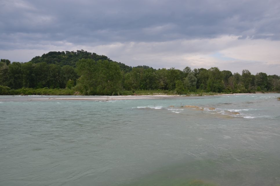 Le rive sono fangose e cosparse di rami e tronchi. Durante la piena dei giorni scorsi il fiume è arrivato a lambire la pista. Ora è tornato nel suo ampio letto e scorre “calmo e placido”. Il colore dell’acqua adesso è verde scuro. Anche il Piave si è adattato alla nuova atmosfera bucolica dei luoghi.