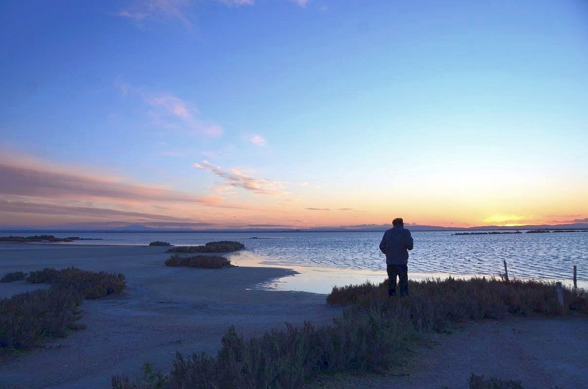 Mentre rientro, guardo lo spettacolo del tramonto del sole sui monti della Daunia. I raggi si riflettono sull’acqua delle saline e sui cristalli di sale lungo le rive. Una cortina di salicornie dorate fa da paravento ad un paio di fenicotteri alla ricerca del luogo adatto per passare la notte, ondeggiando come equilibristi su una sola zampa.